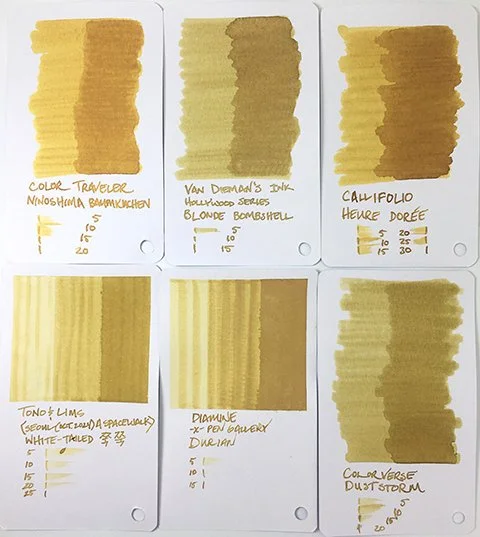 I really like this ink. It’s a very usable yellow and the sometimes soft, sometimes bold shading and color variety really make this ink stand out. You can find it at PenGallery individually or in the Kaweco set. In addition, it is available at BlueBlack in Korea, which is where I got my bottle. If you like complex, dark yellows, this is a particularly good one. If you normally stay away from yellows, give this one a try. Like the fruit, one try and you just might want a lot more!
