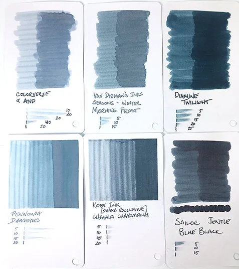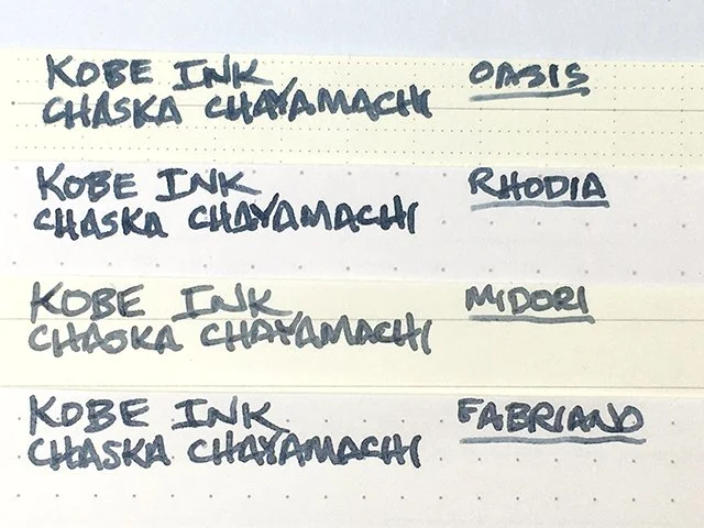 As you start to write, Chaska Chayamachi is the blue of a morning sky hinting at rain ahead. It’s a light-to-medium blue with gathering influences of grey as the ink dries. The forecast for what is to come depends on the paper you’ve paired the ink with (and of course, the width of the nib). As you can see, the final results can range from lighter to darker medium grey-blues. On office copy, the balance shifts giving a slightly bluish, light grey when dry. From well-worn old jeans to Tsuki-yo blue, I find this a very easy ink to like.