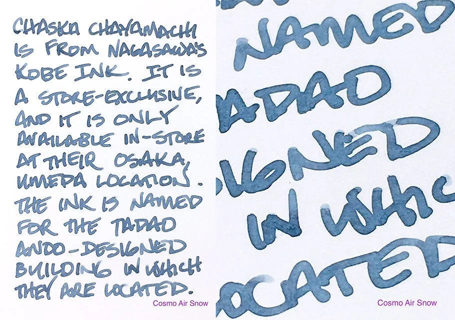 Nagasawa’s Osaka (Umeda) branch has a special ink only available in the store. Named for the Tadao Ando-designed building where Nagasawa is located, Chaska Chayamachi is more than just a great souvenir of a visit. If this were part of the regular line, I think it would be quite popular. The color is attractive and interesting, but it would be perfectly appropriate in a work setting, too.
