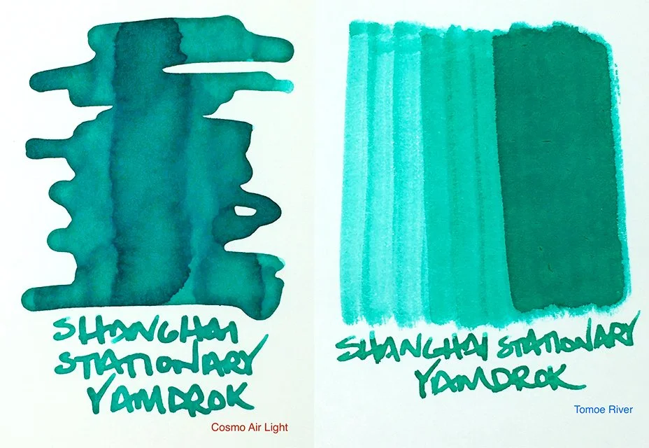 High up on the Tibetan plateau, Yamdrok lake is known for its stunning turquoise, jade waters. Shanghai Stationary Yamdrok brings the colors to life. It’s a beautiful ink, both simple and complex in shading and color. Overall, I’d like to call it an aquamarine green, but from paper to paper, you’ll see it as a turquoise green, and even an emerald (Tomoe River and Takasago Bank papers). It’s a strong shading ink, and stroke ends bring out a lot of the aquamarine green highlights that for me define the color.
