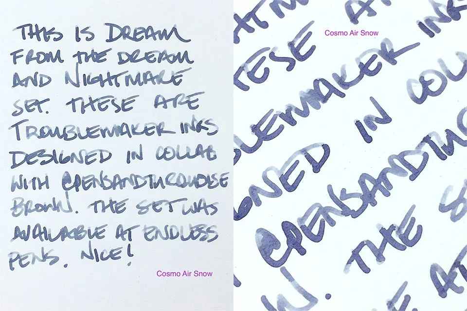 The three-ink set and the Dusk pen it originally was meant to accompany are no longer available. However, as of writing, individual bottles of Dream and Nightmare are still available. These are the big, 60 ml Troublemaker bottles, and the price is around US$20. You can find them at Endless pens.