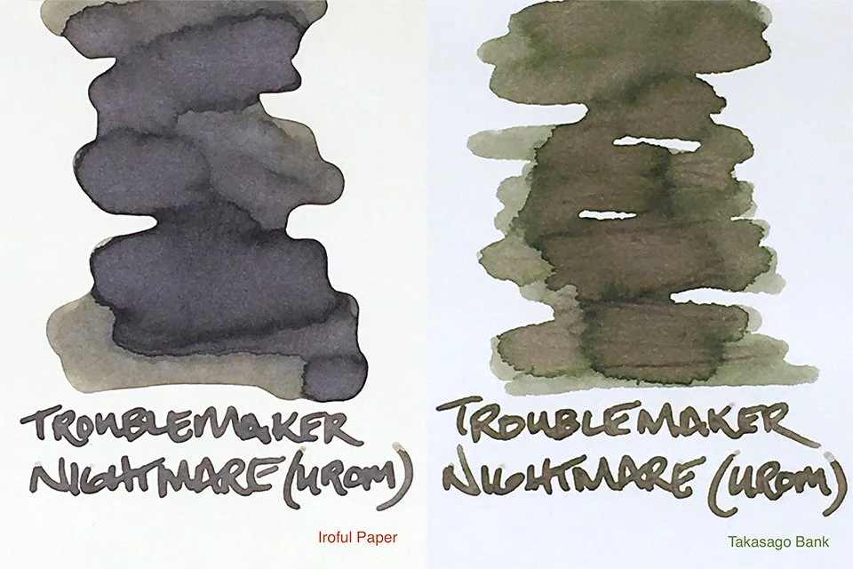 From paper to paper, the results differ widely. I love the hints of purple on Cosmo Air Light, CA Snow and Iroful (there’s a bit on Rhodia, too.) On Tomoe River yellows and hints of green emerge, and on Takasago Bank (always unpredictable) the greens are really proud. I don’t think I’ve ever seen a brown-based ink with so much surprise! You’ll either love it or hate it!