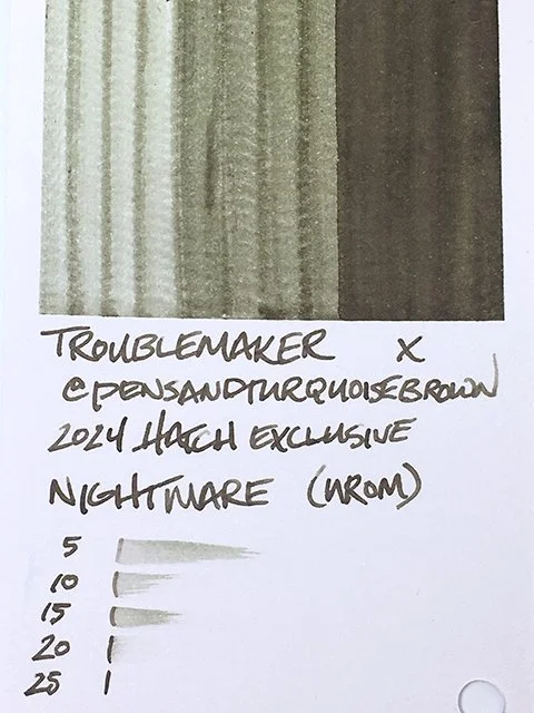 While you might see Dusk as the prettiest, and Dream as the most usable ink on a day-to-day basis in the three-ink Dusk series from Troublemaker and @pensandturquoisebrown, Nightmare (Urom) might be the most interesting. It is indeed a muddy reflection of a bad night’s sleep, but it’s the kind that can be very appealing and quickly grows on you.