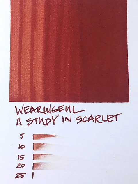 A Study in Scarlet is a gorgeous, medium deep red, with very little lean in terms of pink, purple, or brown. Shading occasionally gives the illusion of hints of yellow as the ink thins, and the white of the paper becomes an accomplice to the crime. However, as the swatches show, this red sticks to its scarlet alibi with remarkable consistency. In terms of color, this red is exactly what I like.