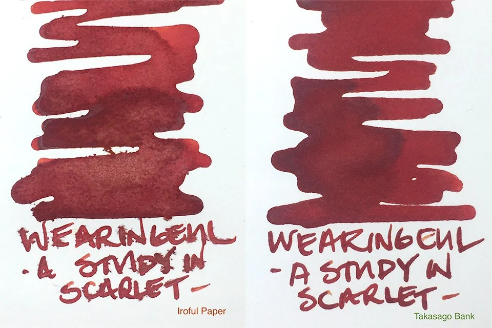 I can forgive the problems found on Iroful, and I have continued using this ink. It remains enjoyable and attractive on everything else I regularly use. If you can overlook the mismatch with Iroful, Wearingeul’s A Study in Scarlet is an ink you’ll almost certainly enjoy, too. The 5 ml bottle in my image is only available at Wearingeul pop-up shops (maybe only in Korea), but it normally comes in Wearingeul’s standard 30 ml bottles and their top-quality packaging. If scarlet is your kind of red, don’t hesitate!