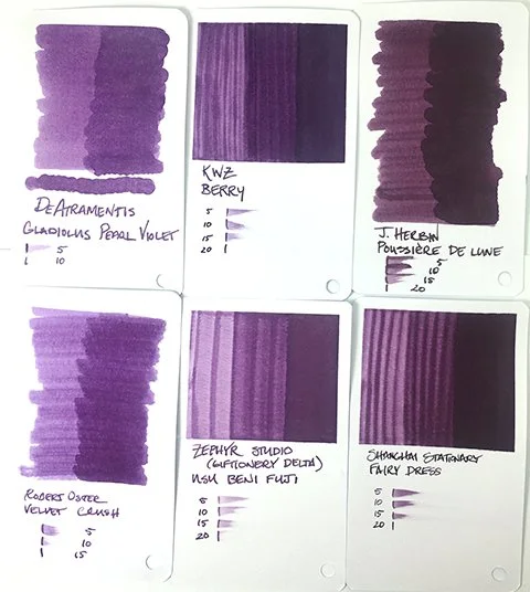 This is a nice, consistent, very stable writing ink. I didn’t have a problems with feathering or spreading. Strokes were always crisp and sharp. Ink flow is neutral to wet, and never hints at being dry. Drying time was average or better, as well. I really like this ink.